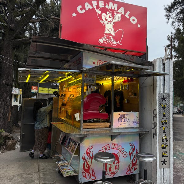 Malo: es un puesto de café en la calle; rico, aesthetic, cool y venden lentes de sol padres y baratos